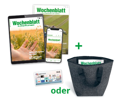 *Falls Sie das Wochenblatt nach 3 Monaten nicht weiterlesen möchten, senden Sie bitte innerhalb von 14 Tagen vor Erhalt des letzten Heftes bzw. des ePapers eine Mitteilung an das Wochenblatt für Landwirtschaft und Landleben, Leserservice, 48114 Münster. Die Lieferung bzw. Nutzung wird dann sofort und ohne weitere Verpflichtung eingestellt. Oder Sie lesen das Wochenblatt ohne Risiko weiter und können Ihr Abonnement jederzeit kündigen. Zu viel bezahlte Beträge erhalten Sie zurück. Halbjahresbezugspreis Print: 99,84 € (Preis einschließlich Versandkosten und MwSt., gültig für 2025), Halbjahresbezugspreis Print und Digital: 113,34 € (Preis einschließlich MwSt., gültig für 2025). Die Bestellung erfolgt im Geltungsbereich unserer AGBs und Datenschutzhinweise. Wir verwenden die Daten Ihrer Bestellung, um Sie gelegentlich über ähnliche Angebote zu informieren. Dem können Sie jederzeit beim Verlag widersprechen.